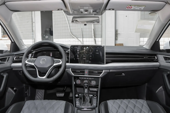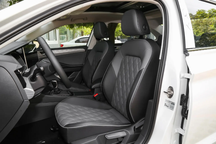 内饰设计方面,速腾依旧是从T型中控中演变出来的设计,方向盘前有8英寸仪表盘,而中控的12.0英寸触控屏则带有一定重心偏转;同时,舱内还有全皮座椅、10色氛围灯、6扬声器以及带后座出风口的空调系统;不过,像全液晶仪表、无线充电板、座椅加热/通风等功能还是需要选装的。